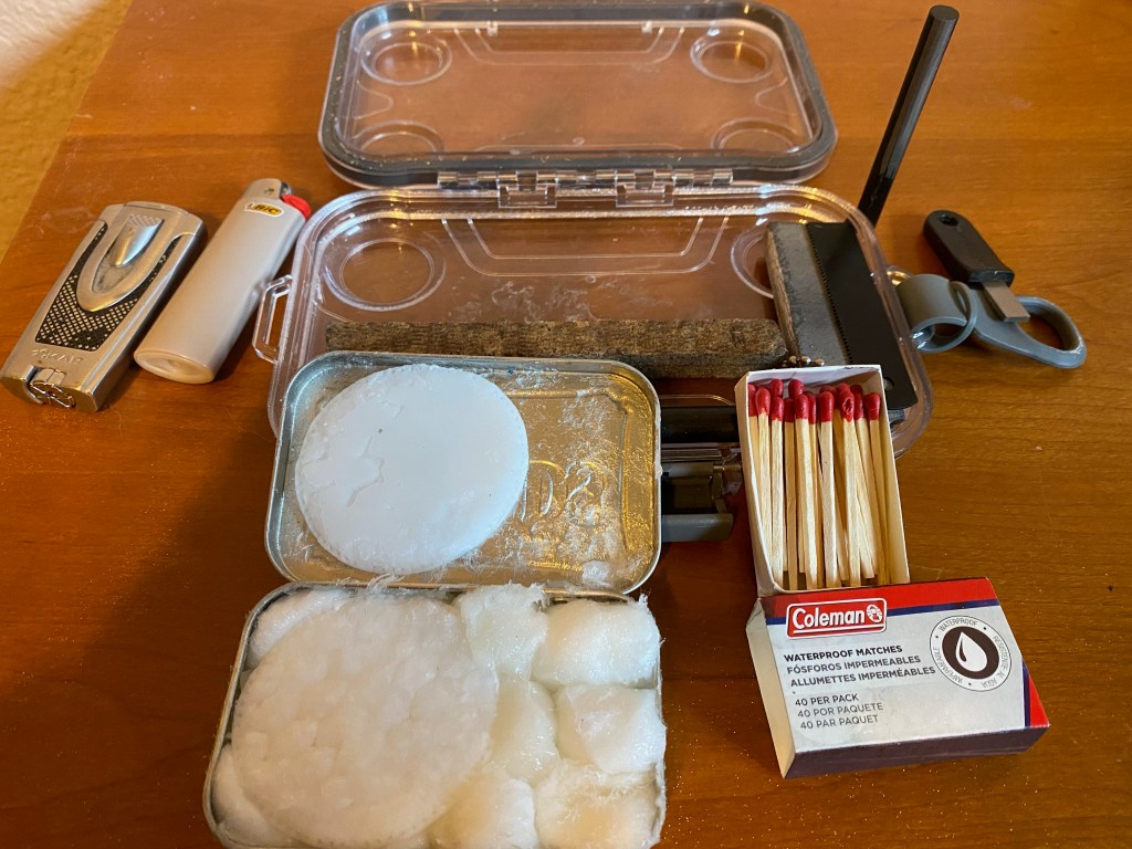 I can fit eight or more cotton balls inside of the Altoids tin, however, I found when I am hiking, I rarely used more than two cotton balls. This evolved into the Tin being filled with 4 dipped cotton balls and 4 untreated cotton balls. At the same time, I discovered my usual make up remover pad coated with wax fit snugly into the Altoids cans as well. Furthermore, I discovered a small Ferro Rod and striker would also fit inside. If I had trouble closing the lid a rubber band would hold it closed. A short time later I made an important scientific discovery; I did not like a Petroleum Jelly covered Ferro Rod and Striker and found them somewhat difficult to work with. This led me to purchase a random water proof container at Walmart to expand my fire kit. ( Outdoor Products Smartphone Watertight Case, Clear, Durable Latch and Compatible with Most I-Phones, Samsung Galaxy, T-Mobile, and Other Cell Phones. – Walmart.com – Walmart.com ) I have not tested the water tightness of the case due to it being purchased more for organization. The Ferro Rods moved to the outside of the Altoids tins. However, Parkinson’s Law comes into effect here and I filled the voids of the storage container with other items.